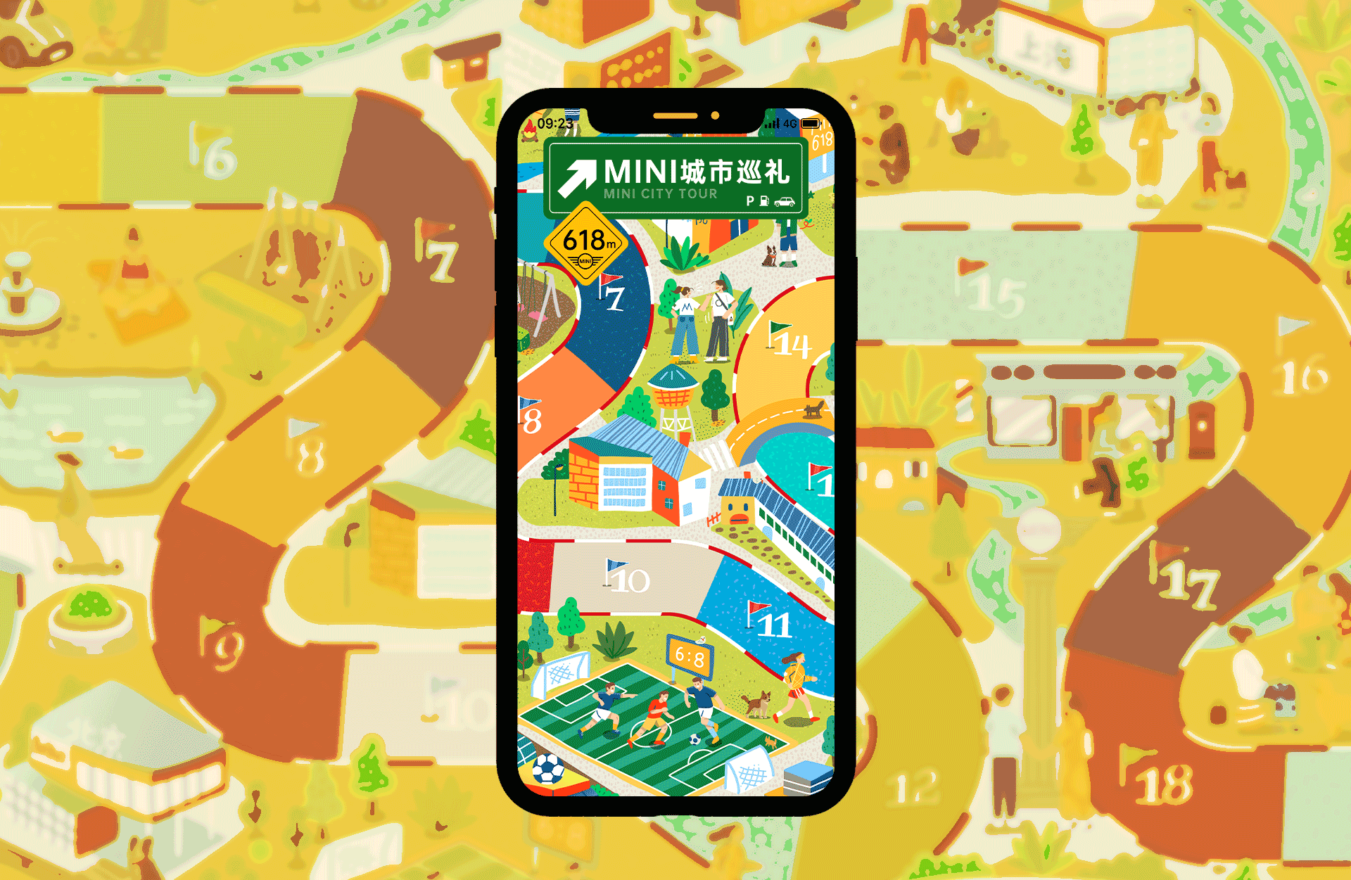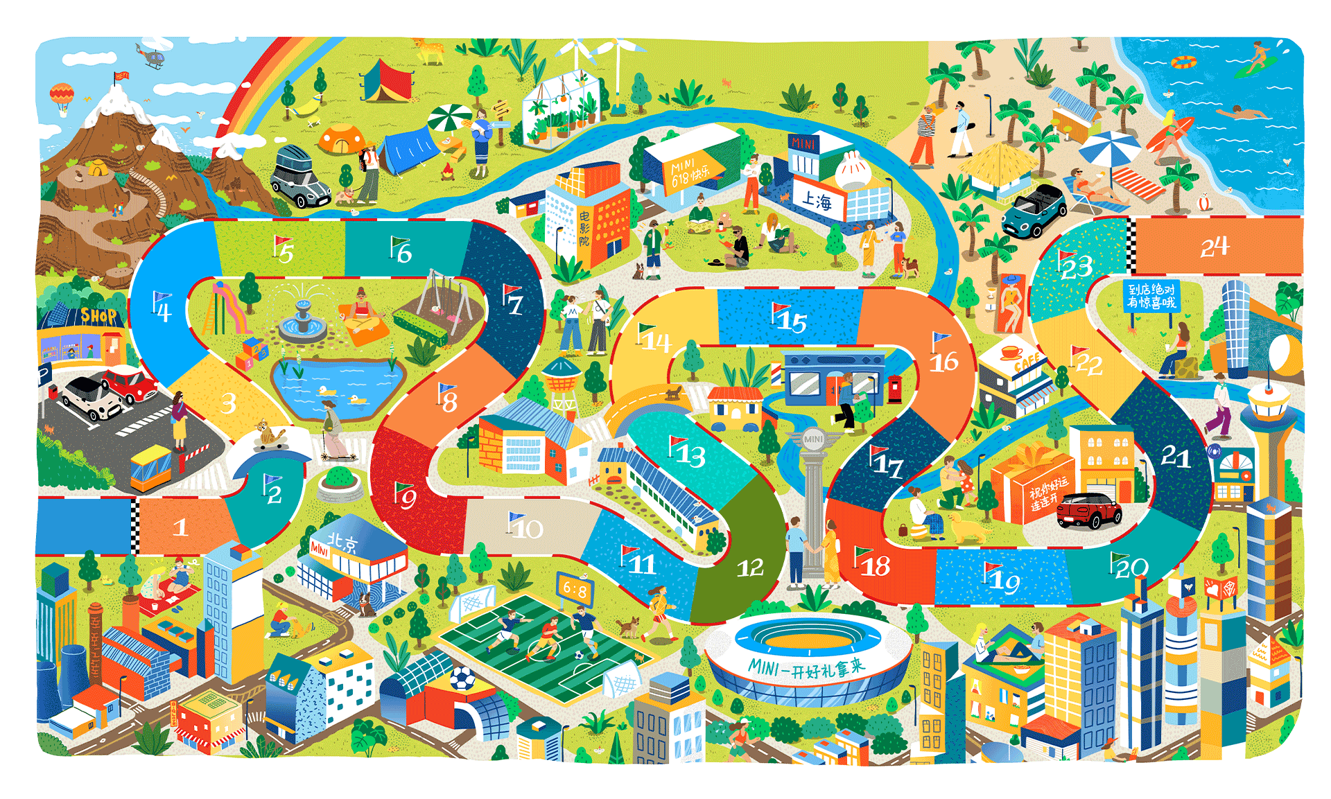2021年5月14日接到Brief , 6月11日上线我们要为MINI 618活动绘制一个图版游戏需要画一张巨幅的城市地图和各种游戏小元素用户可以在这张地图中用掷骰子的方式沿着棋盘格,从山到海,驾车游览整个MINI城市如果经过不同的MINI 4S店,还有机会赢会员好礼为了让这个MINI城市生机勃勃我们好像玩Sims City一样,私心满满的加了自己喜欢的都市场景有山可以露营,有公园可以遛狗/瑜伽,有体育馆健身,有咖啡屋,有纪念碑,有电影院,有大大的碧蓝海滩