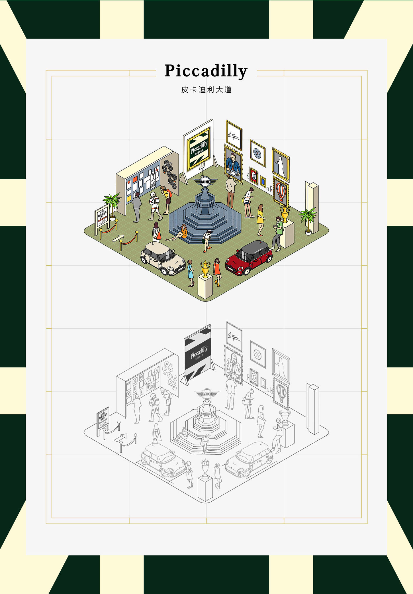 A series of isometric illustrations drawn for the MINI event, Each pieces are based on iconic places in the Great Britain, also reflects the characteristics of the car.